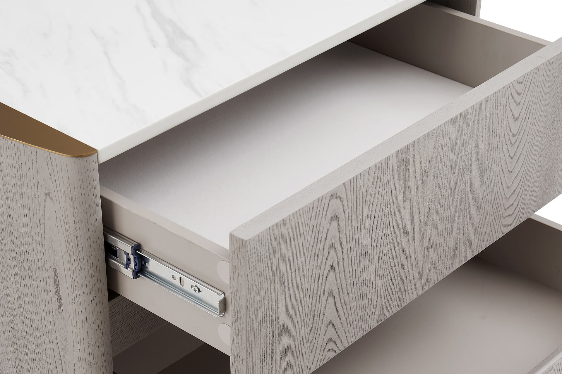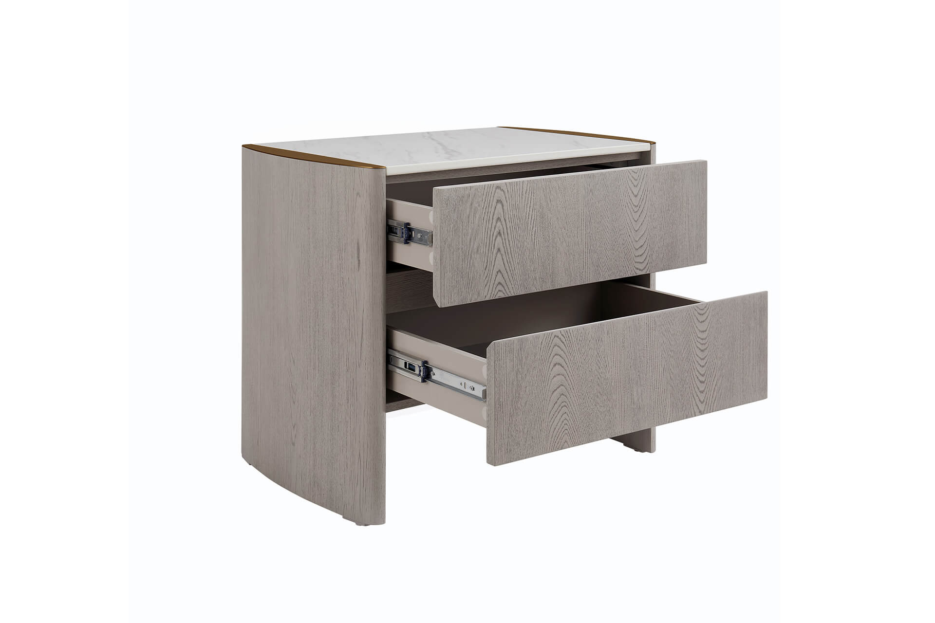 Mondello 2 Drawer Bedside Table in Washed Oak combines luxurious design with high-performance materials. Crafted with a durable elm veneer and a sintered stone top, it's edged with brushed stainless steel for a sleek finish. The stone surface is stainproof, antibacterial, scratch-resistant and waterproof and easy to clean, while two spacious drawers offer practical bedside storage. A stylish and functional addition to any modern bedroom.