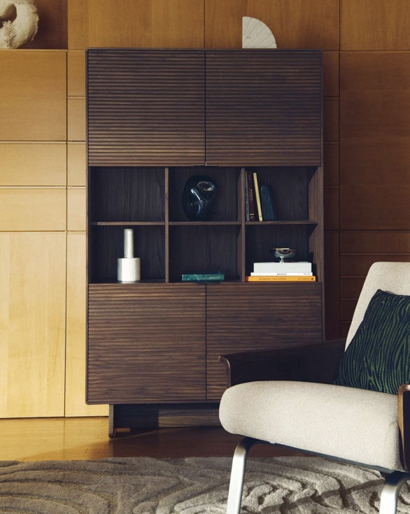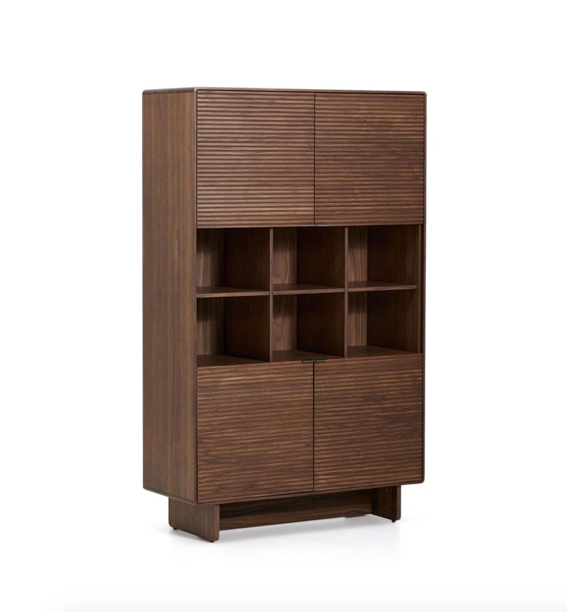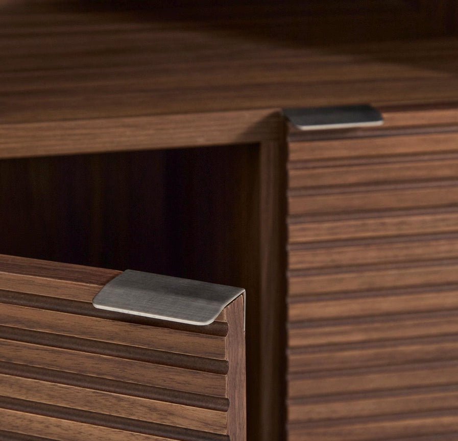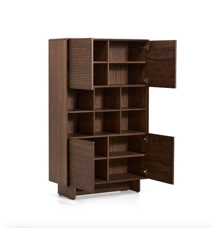- Sideboard in 0.6mm walnut veneer. 4 doors with soft-close hinges and visible central shelves.