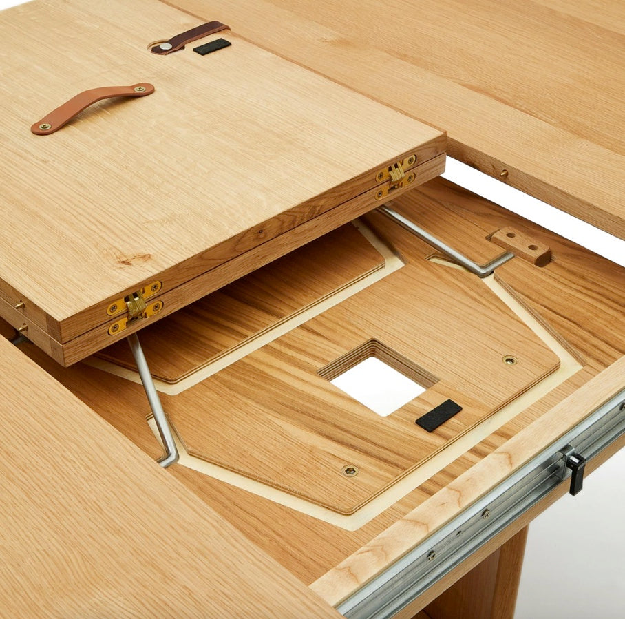 - Easy-opening extension with butterfly mechanism and a leather handle. Includes a 50 cm extension concealed inside the table.