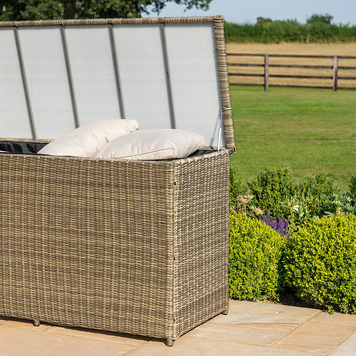 Practicality meets style with the Cheltenham Storage Box. This top loading storage box is perfect for keeping your cushions and other garden accessories free from dirt and dust when not in use. With a solid protective top and woven rattan sides, it perfectly complements your furniture sets, while keeping your garden tidy. In addition, we have now included a black PVC lining inside the box which will provide extra protection for your cushions.