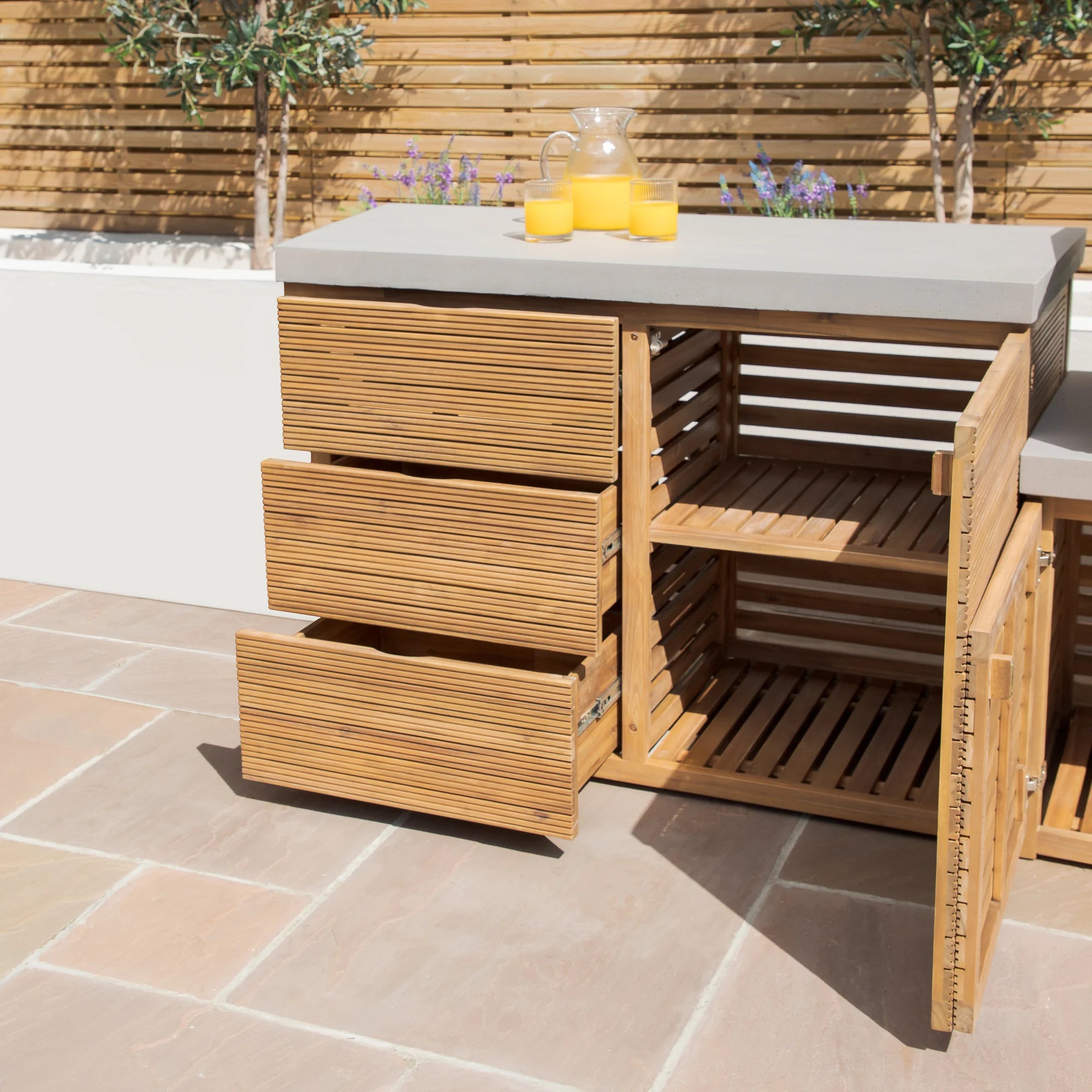 Upgrade your outdoor entertaining game with our Bali Medium Outdoor Kitchen Storage Unit configuration. It boasts a chic wax concrete look top with distinct imperfections that pay homage to the current industrial trend. The durable sustainably sourced acacia wooden frames complement the stylish top and offer reliable support for all your cooking needs.
