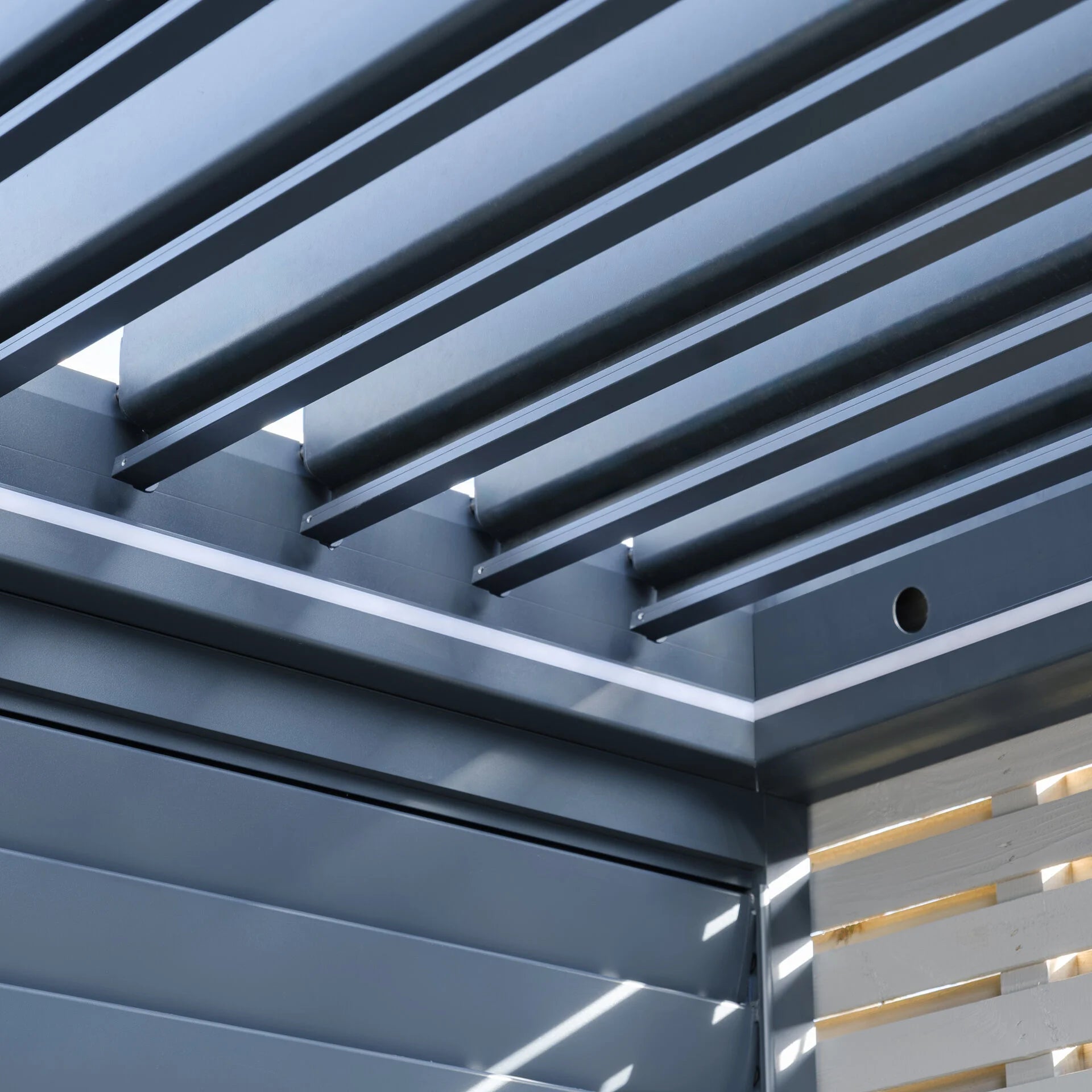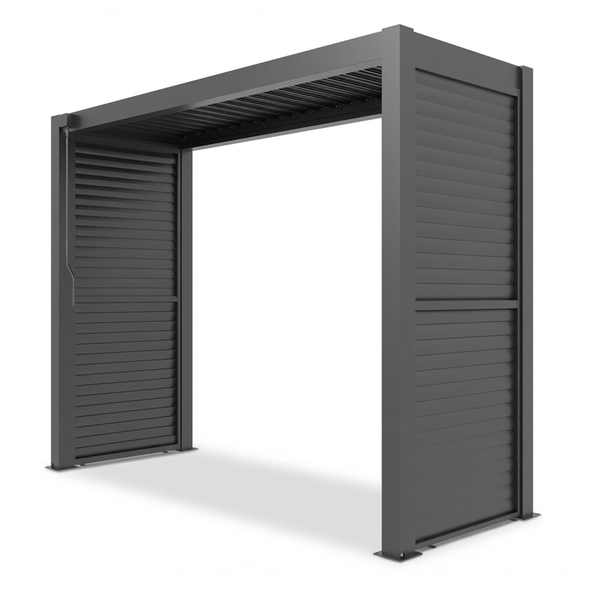 The Como BBQ Shelter is freestanding, allowing flexible placement within your garden, and it can also be positioned against a solid back fence or wall if preferred. Constructed from durable, powder-coated aluminium in an elegant grey finish, the Como BBQ Shelter is designed for long-lasting performance with minimal maintenance. The manually operated louvre roof allows you to control light and airflow, creating a waterproof canopy during wetter months. During heavy downpours, the integrated drainage system channels water through the frame and down each leg.