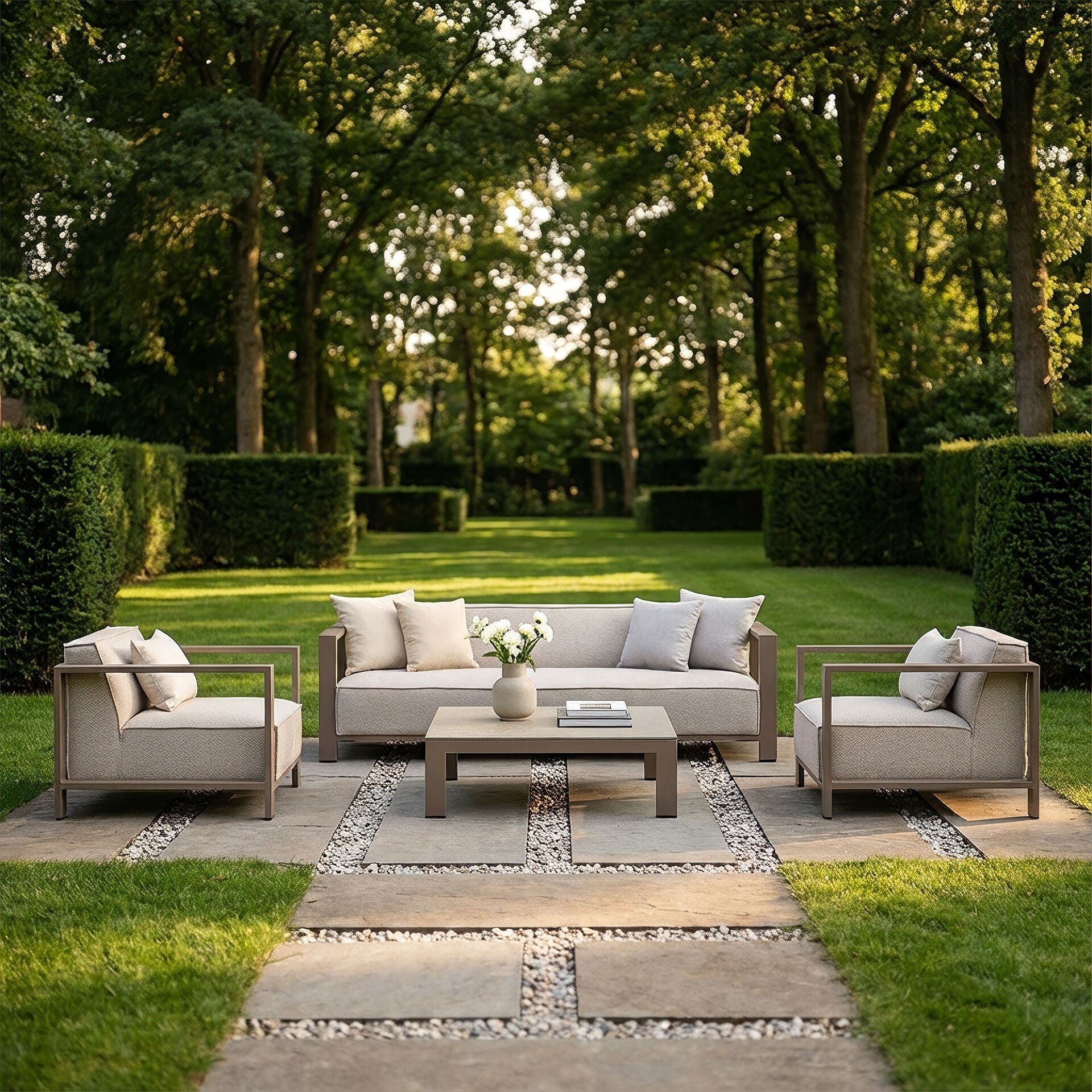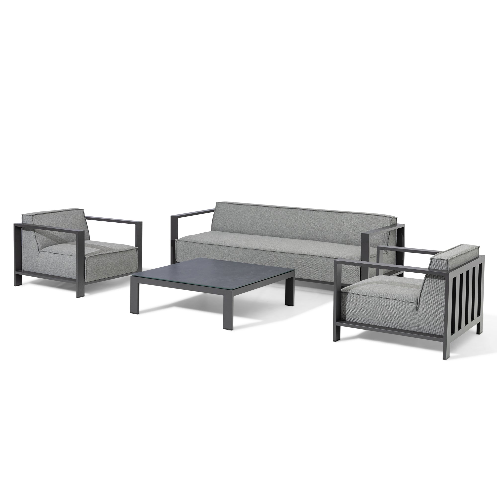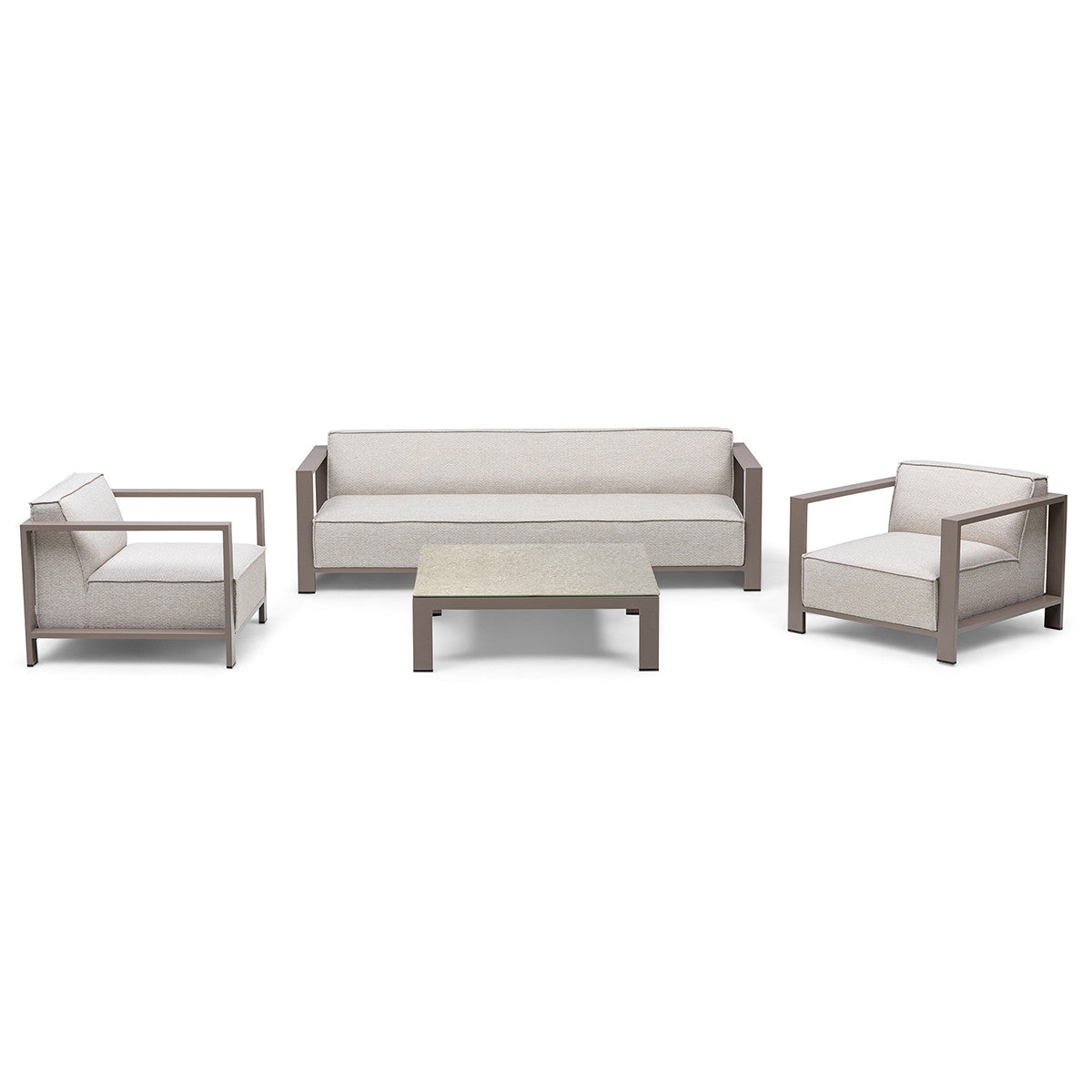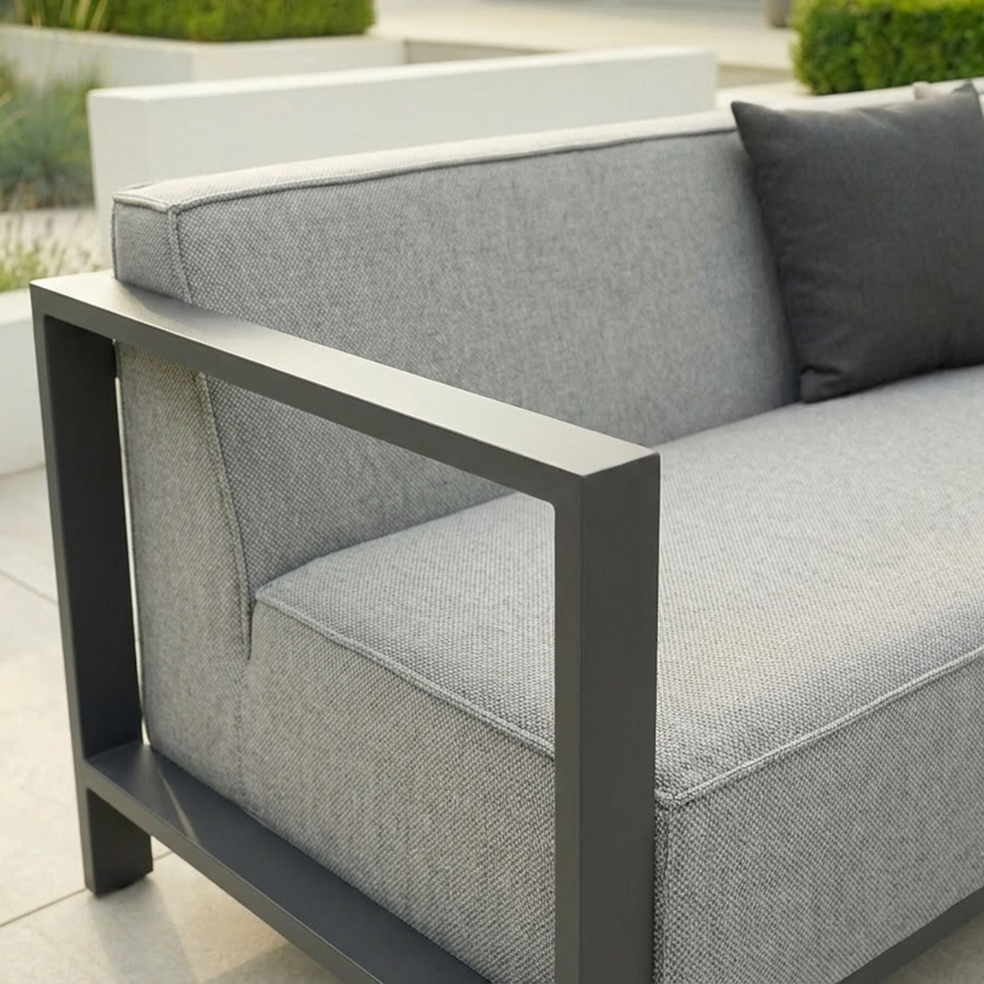 This Mykonos 3 seat sofa set has been designed as a fully upholstered sofa which has been designed for both functionality and comfort. The ultra quick dry cushioned seats have been upgraded with additional fillings for added comfort. Over this we have overlaid the durable all weather Latte or Zinc Grey colour fabric, resulting in a chic, modern outdoor garden sofa set which is able to withstand the entire year outside in the UK climate.