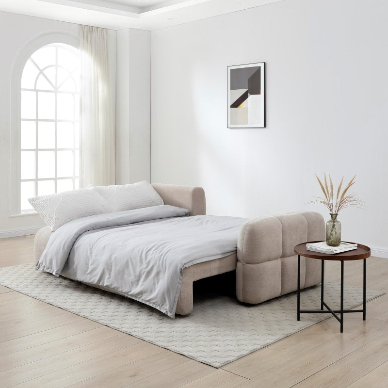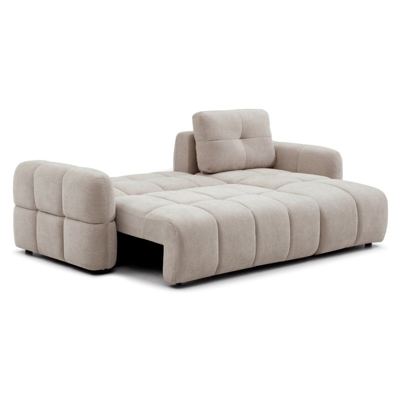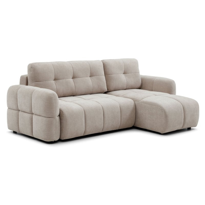 A brand-new quilted corner sofabed with a lovely curved profile and plump seating. It includes shallow storage under the seat for pillows or extra bedding and easily converts into a comfortable sleeping area. Designed to create a low, loungy feel with enveloping comfort, the piece is fully upholstered in soft taupe chenille fabric.